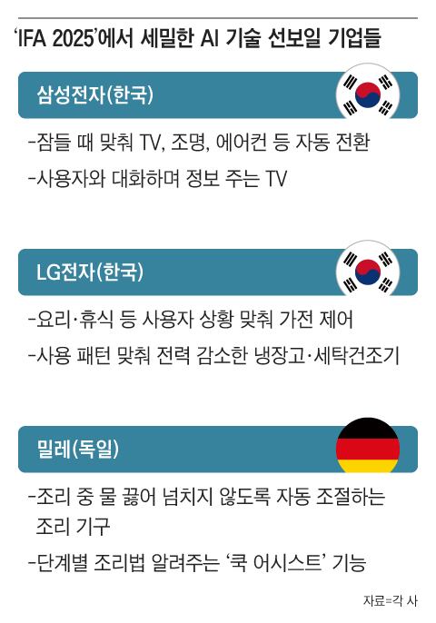 Samsung Electronics participated in IFA 2025 under the theme ‘AI Home, Bringing the Future into Reality.’ Its AI Home offers personalized, fine-tuned control. Based on sleep data collected via Galaxy Watch or Ring, the AI recommends optimal bedtime and automatically adjusts connected devices—such as TVs, lights, and air conditioners—via SmartThings before sleep. Samsung also displayed a TV that converses with users, an AI-equipped refrigerator, and a washer-dryer.